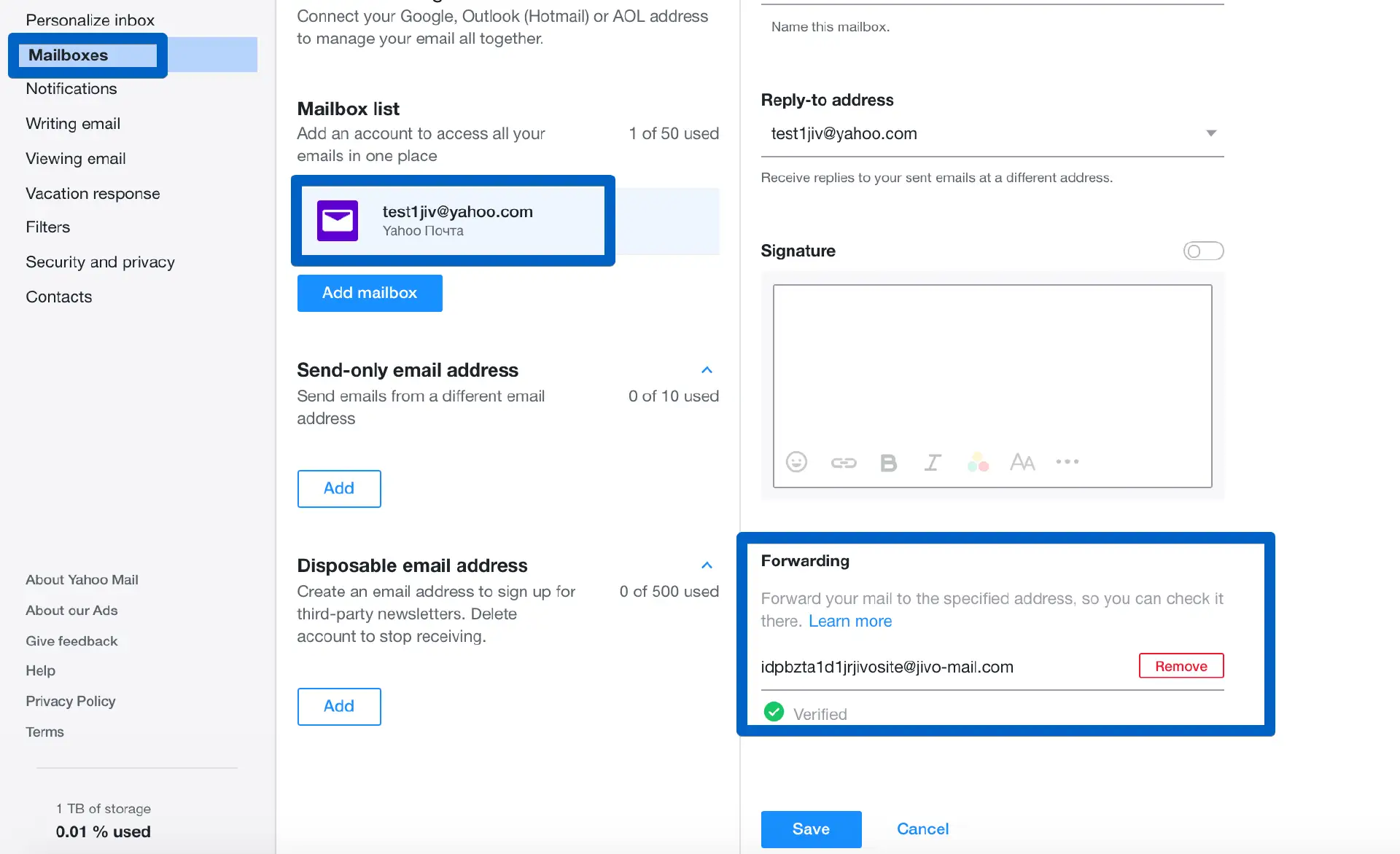 2. Go to "Mailboxes", click on your email in the Mailbox list, then find "Forwarding" section and put email address you got from JivoChat there.