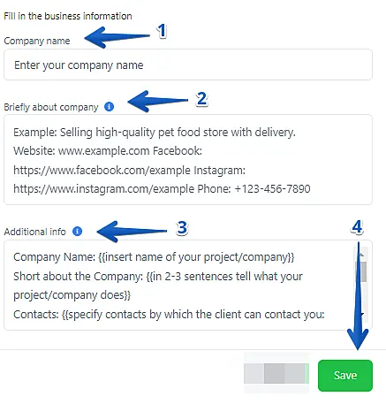 - Summary about the company - in this field, tell us what the company does, indicate contacts, social media links, website (follow the example of the tip on the form). Remember that it is Based on this field the artificial intelligence model will select the answers.