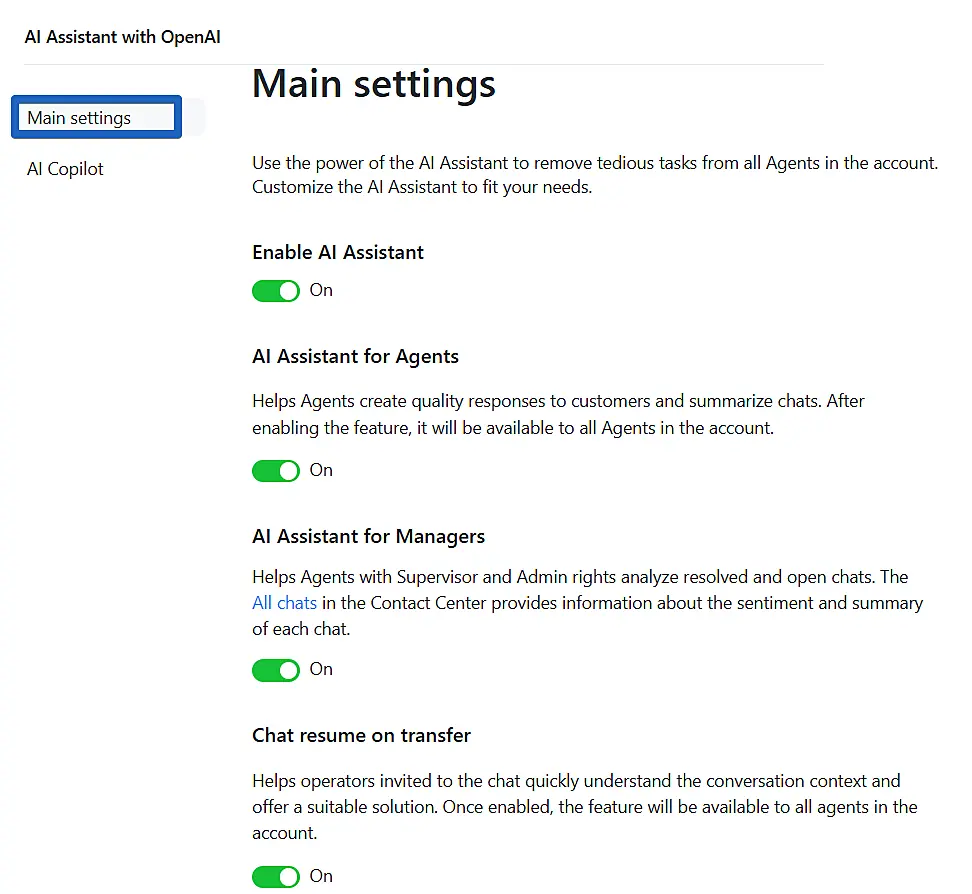 The "AI Assistant" function is an innovative solution for customer service operators, as it speeds up the conversation process with customers and increases the quality of service. The main aspect of this feature is the ability to generate automatic responses to frequently asked questions.