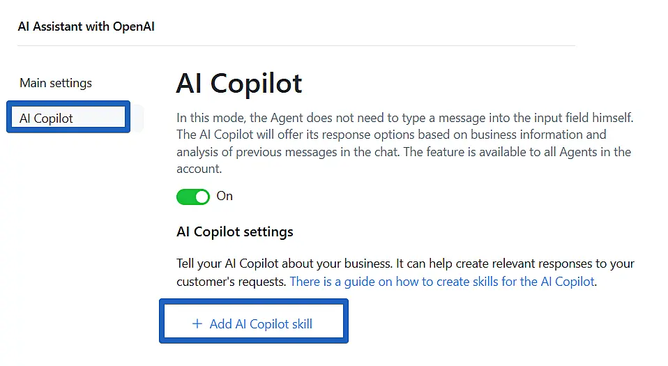 Now enable "AI Copilot for Operators" and then click on the "Add AI Copilot Skill" option