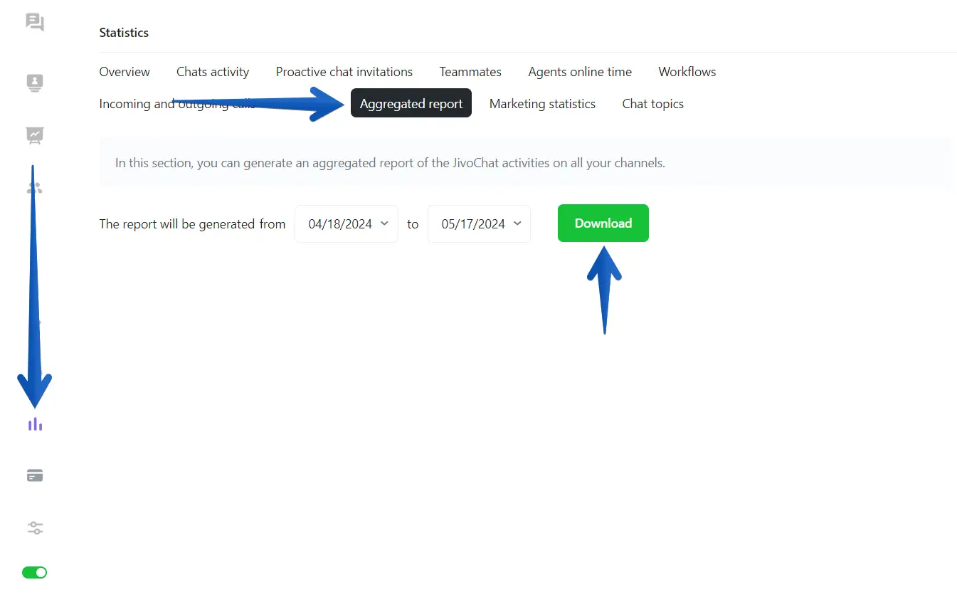 1.Open the JivoChat web app, or any of our Desktop apps, and go to Statistics -> Aggregated Report.