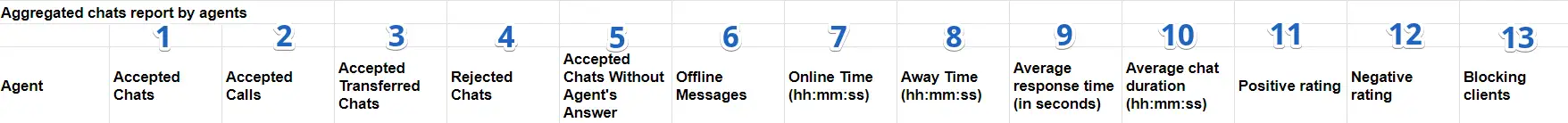 The parameters are the same as the "Aggregated chats report by agents".