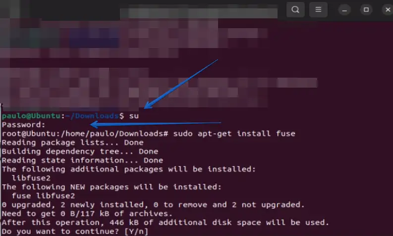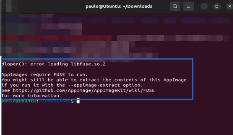 When running the installation commands, it may be necessary to install some library. Let's use the example of the error reproduced in the print below, which in this case is "Error loading libfuse".