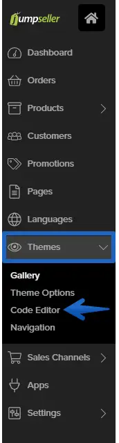 1. Access your Jumpseller admin panel and go to "Themes" -> "Code Editor".