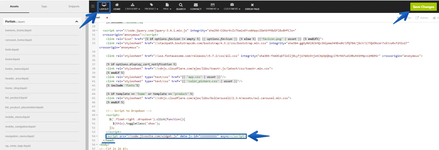 3. Paste the JivoChat installation code right above the </head>