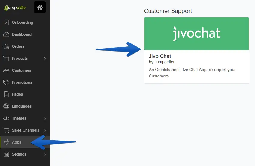 1. Access your Jumpseller admin panel and go to "Apps" -> Find and click the "JivoChat" app.
