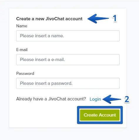 4. If you already have an account at JivoChat (2) proceed to the next step of this tutorial. If you don't have an account yet (1), insert a name (agent name - can be changed later), email and password (at least 6 characters - must contain at least 1 number and 1 upper case letter), click to "Create Account" and proceed to step 6 of this tutorial.