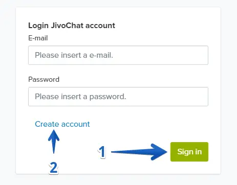 5. Insert your credentials from your existing JivoChat account and click to "Sign In" (1). If you don't have an account yet, click to "Create account" (2) and check the previous step of this tutorial.