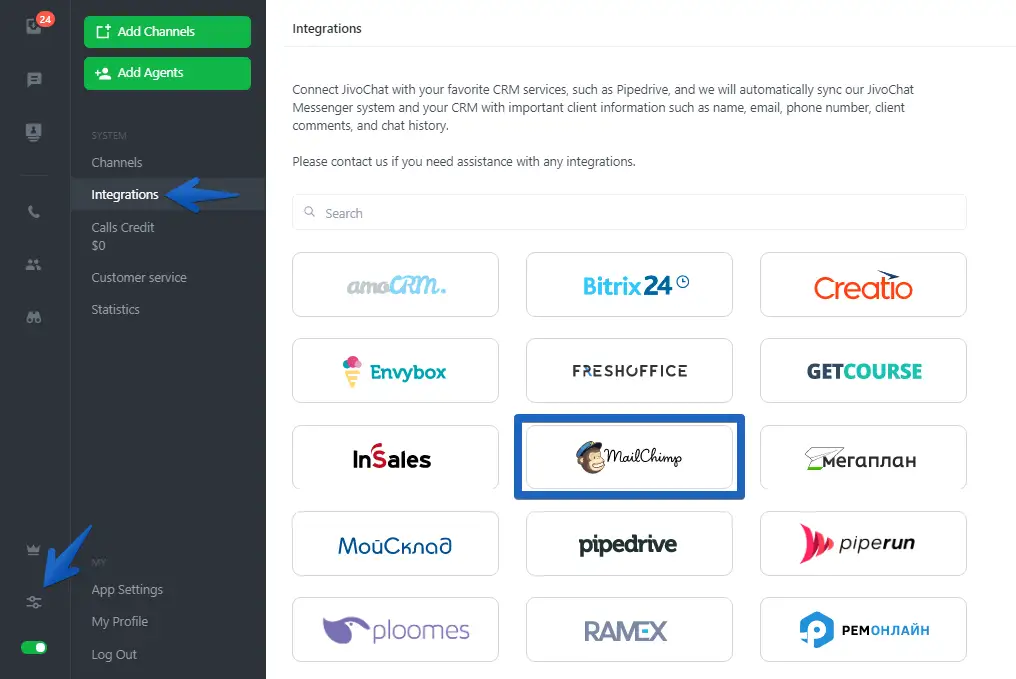 To connect MailChimp, access your JivoChat web application or one of our Desktop apps and go to Manage -> Integrations -> MailChimp.