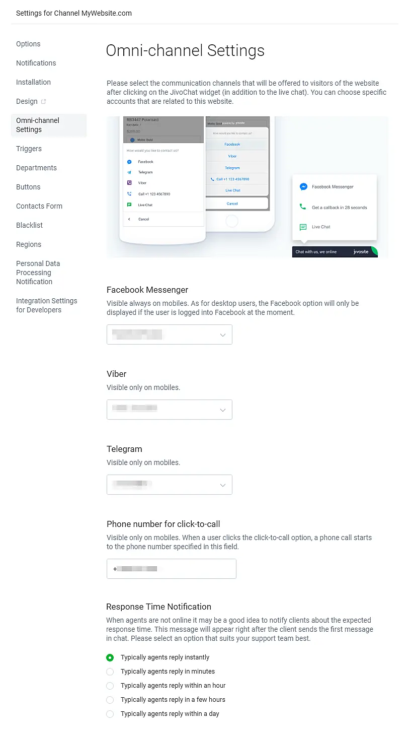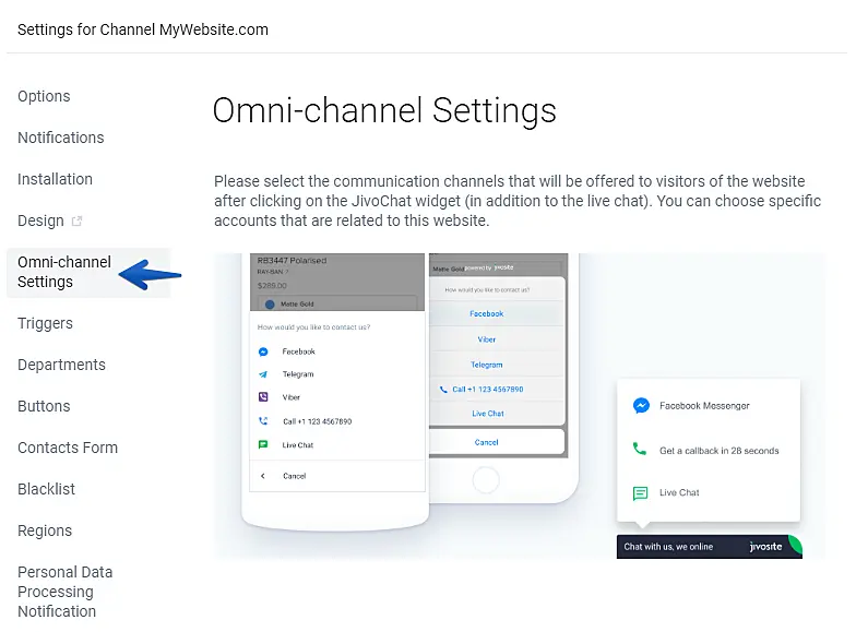 To start using the omnichannel feature, you should first integrate the messangers with your JivoChat account: Facebook, Telegram, Viber.