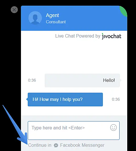 The desktop version of the chat widget has a bit different appearance: in the lower part of the chat box a "Continue in Facebook Messenger" label can be found after starting a chat if visitors are connected to Facebook on their browser. They can also start a chat directly from Facebook Messenger if they prefer.