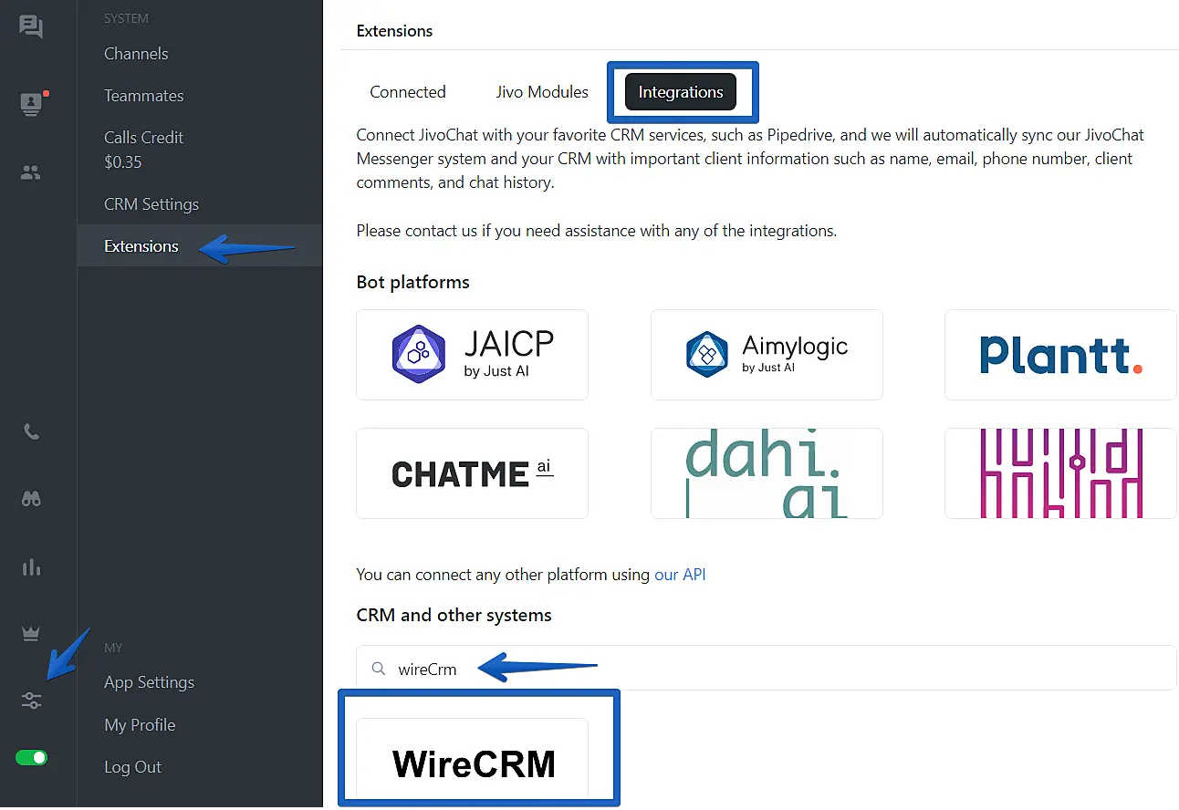 To integrate WireCRM, open your JivoChat application and go to Manage > Extensions >Integrations and search WireCRM.