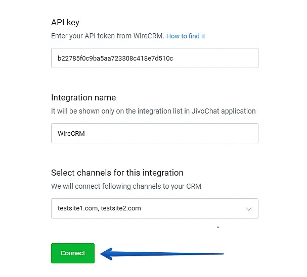 1.API key. You can find it in the settings of your WireCRM profile. Click on your icon in the upper right corner, go to "Profile", copy the API key and place it in this field.