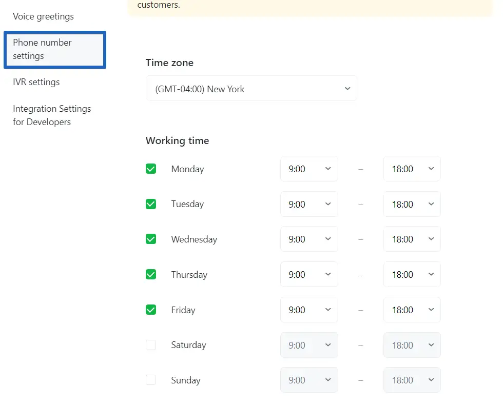 The settings here are divided into two tabs: Working hours and Non-working hours. You can set up a working time schedule in the next section - "Phone number settings".