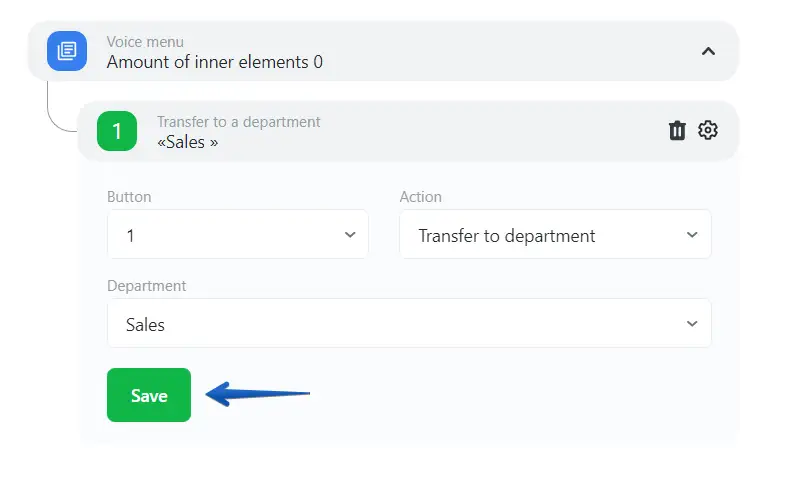 In the "Button" field, select the number "1", since this is the first item of the voice menu. In the "Action" field, one option is available - "Transfer to Department".