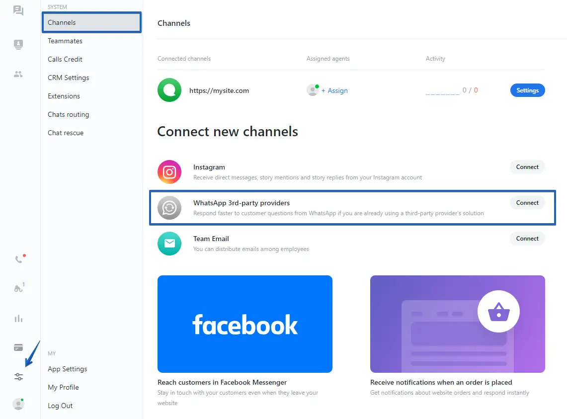 To do that, access your JivoChat web app or any of our Desktop apps and go to Manage -> Channels -> WhatsApp 3rd-party providers.