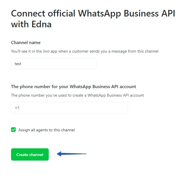 -Assign all agents to this channel: If you checkmark this option, all agents in the account will be assigned to the channel and will be able to receive and answer messages coming from the WhatsApp Business channel. If you uncheck this, only the main admin of the account will be assigned to the channel. You can easily assign/un-assign agents to this channel in the future following this tutorial here.